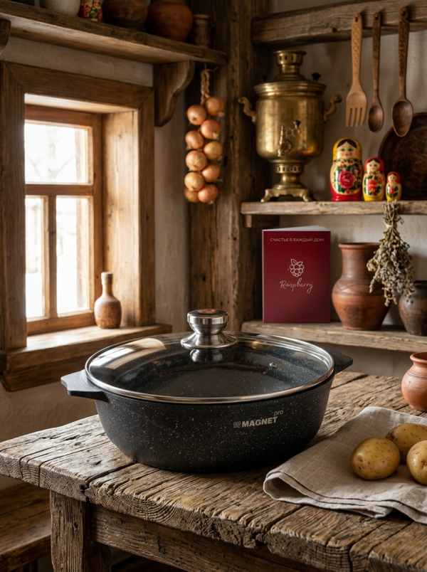 В коллекции Rapsberry и Rapsberry Magnet представлены жаровни, изготовленные из литого алюминия. Это безопасный для здоровья материал, который на протяжении длительного времени сохраняет свои качества. Он устойчив к механическим повреждениям в виде царапин, истиранию. Антипригарная жаровня с утолщенными стенками быстро нагревается и долго держит тепло. Массивное дно толщиной 6 мм равномерно нагревает содержимое посуды, обеспечивая постепенную однородную прожарку всех продуктов.
