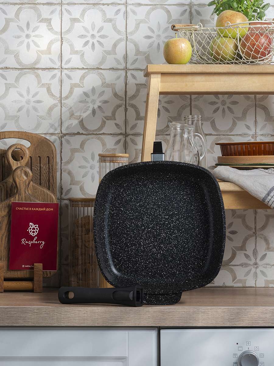 Серия Raspberry подходит для (для газовых, электрических и стеклокерамических плит). Посуда сертифицирована. Экологически чистый пищевой алюминий с прочным антипригарным 3-х слойным покрытием GREBLON C3+ , безопасный для вас и вашей семьи. Линия исполнена в черном цвете, покрытие усилено частицами гранита. Можно пользоваться не острыми металлическими предметами. Цикл использования более 25 000 стираний. Легко моется без химических средств. Можно готовить без масла. Гарантия 12 месяцев.