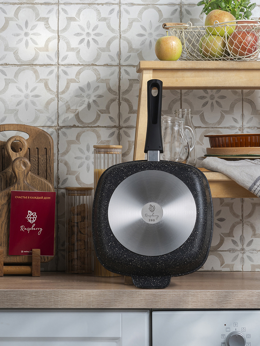 Ваша посуда Raspberry. Для тебя, для дома, для семьи. Дно посуды окрашено, не царапает стеклокерамику и выглядит эстетично, удобная эргономичная ручка, сделана из бакелита, не выделяет запаха при нагревании. Дно посуды не окрашено, но проточено — и не поцарапает поверхность Вся наша посуда сделана литым способом! Это значит, что посуда изготавливается методом ручного кокильного литья (литье в пресс форму) . Поэтому наша посуда не деформируется в процессе эксплуатации, имеет толстое дно — 6 мм и толстые стенки -6 мм. Безопасное антипригарное покрытие позволяет готовить без масла!