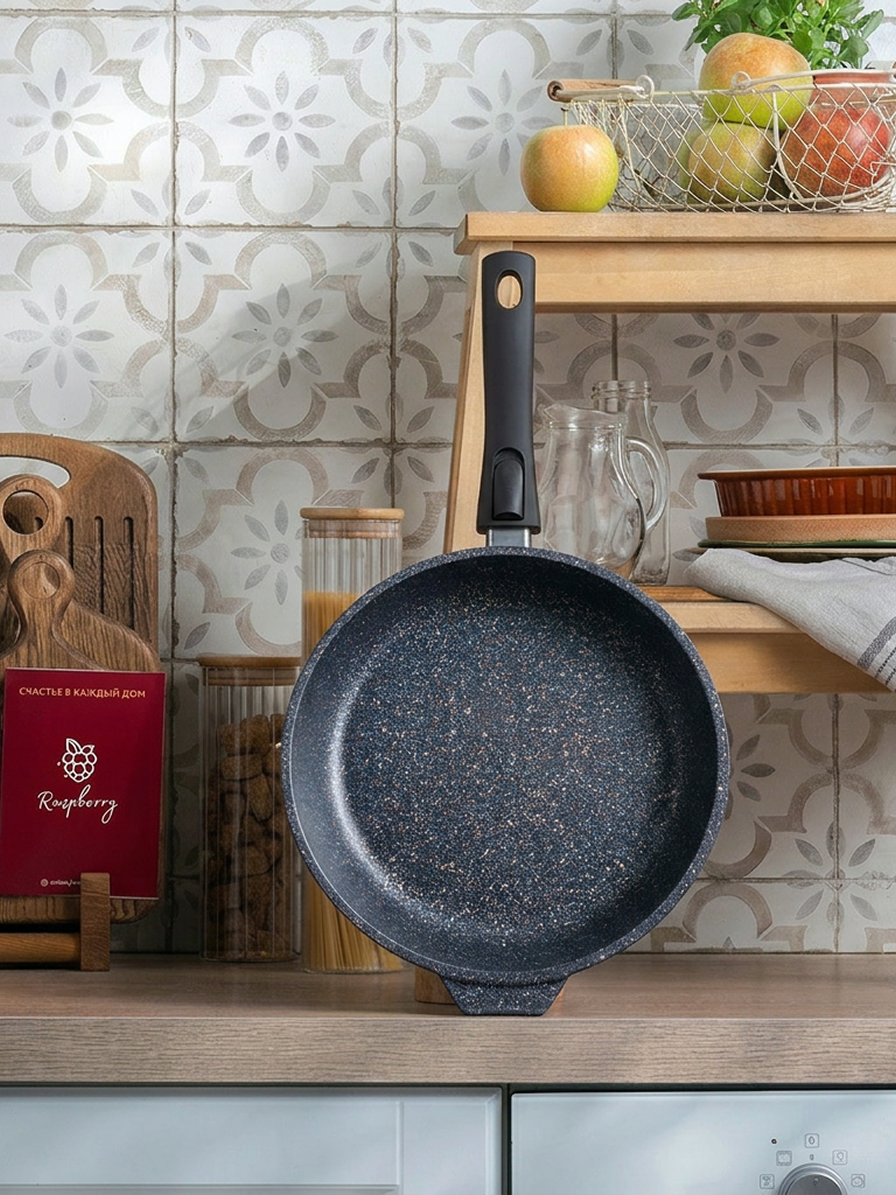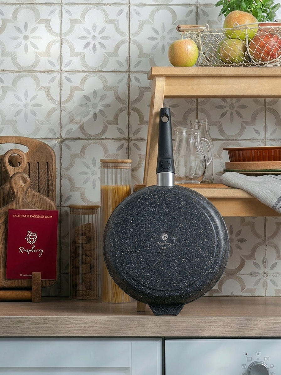 Эргономичная бакелитовая ручка не нагревается, не скользит и не выделяет запаха при нагревании. Окрашенное дно не царапает стеклокерамические поверхности и выглядит эстетично.
