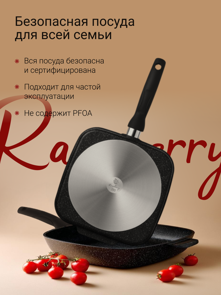 Ваша посуда Raspberry. Для тебя, для дома, для семьи. Дно посуды окрашено, не царапает стеклокерамику и выглядит эстетично, удобная эргономичная ручка, сделана из бакелита, не выделяет запаха при нагревании. Дно посуды не окрашено, но проточено — и не поцарапает поверхность Вся наша посуда сделана литым способом! Это значит, что посуда изготавливается методом ручного кокильного литья (литье в пресс форму) . Поэтому наша посуда не деформируется в процессе эксплуатации, имеет толстое дно — 6 мм и толстые стенки -6 мм. Безопасное антипригарное покрытие позволяет готовить без масла!