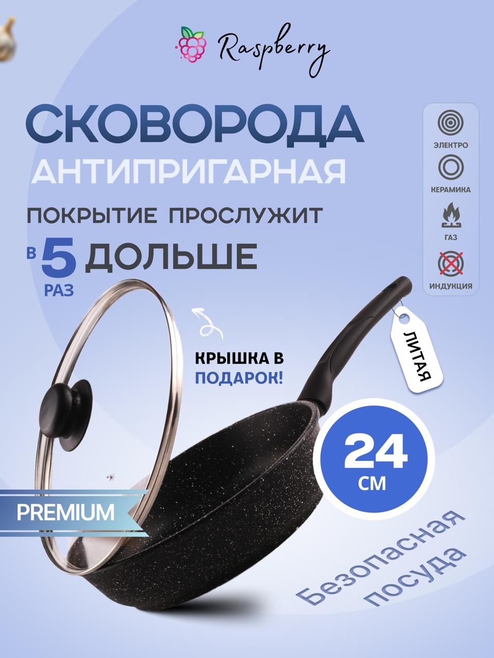 Ваша посуда Raspberry. Для тебя, для дома, для семьи. Дно посуды окрашено, не царапает стеклокерамику и выглядит эстетично, удобная эргономичная ручка, сделана из бакелита, не выделяет запаха при нагревании. Соединительный элемент между сковородой и ручкой — окрашен в черный цвет, не пачкается в процессе эксплуатации. Вся наша посуда сделана литым способом! Это значит, что посуда изготавливается методом ручного кокильного литья (литье в пресс форму) . Поэтому наша посуда не деформируется в процессе эксплуатации, имеет толстое дно — 6 мм и толстые стенки — 4 мм. Безопасное антипригарное покрытие позволяет готовить без масла!